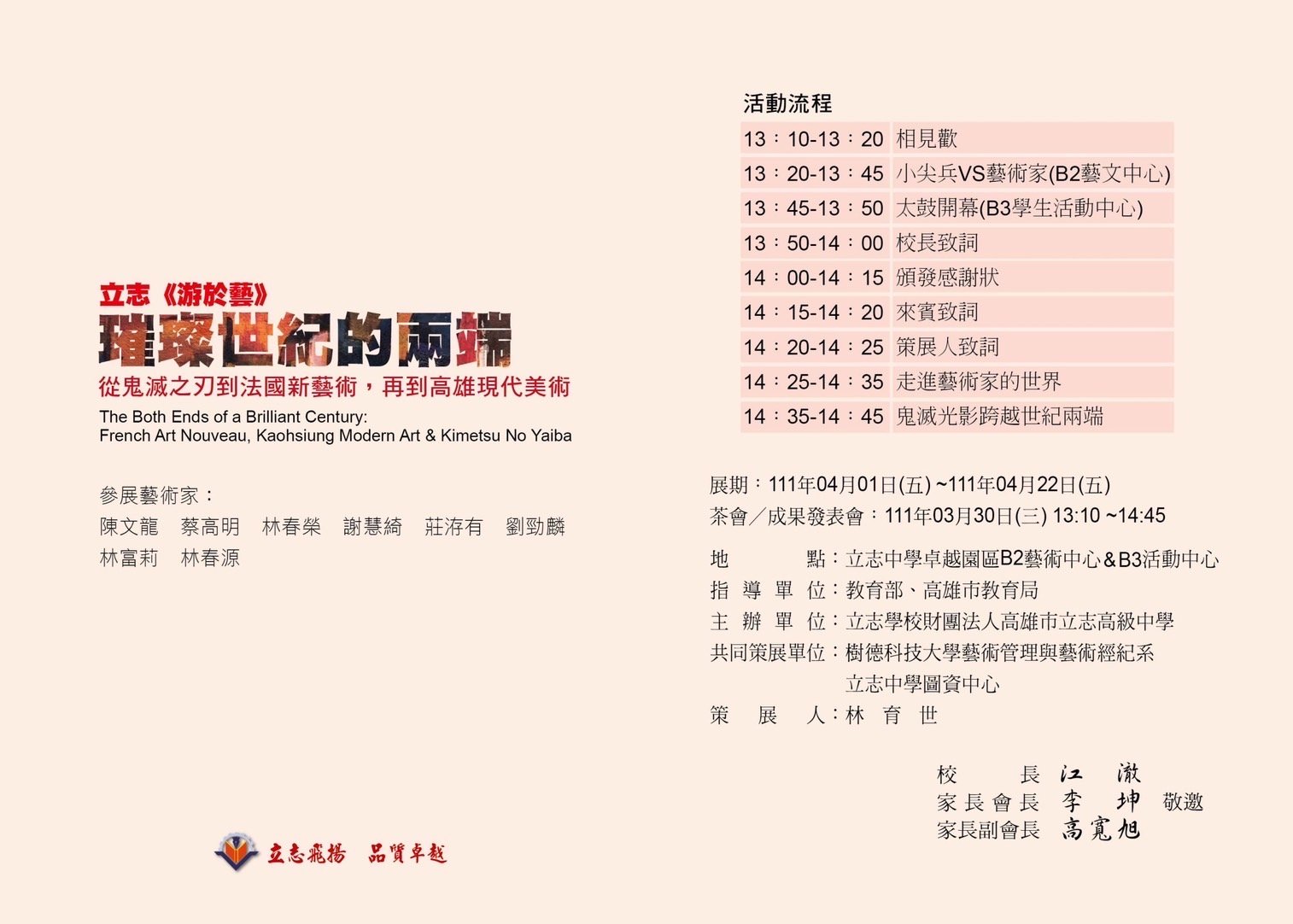 立志「游於藝」,璀璨世紀的兩端 Super User 本站新聞 28 三月 2022 點擊數: 1367 Email 展期:2022年4月1日(五)~4月22日(五)茶會:2022年3月30日(三)13:10~14:45地點:立志中學卓越園區B2藝術中心、B3活動中心 上一篇 下一篇 tweet