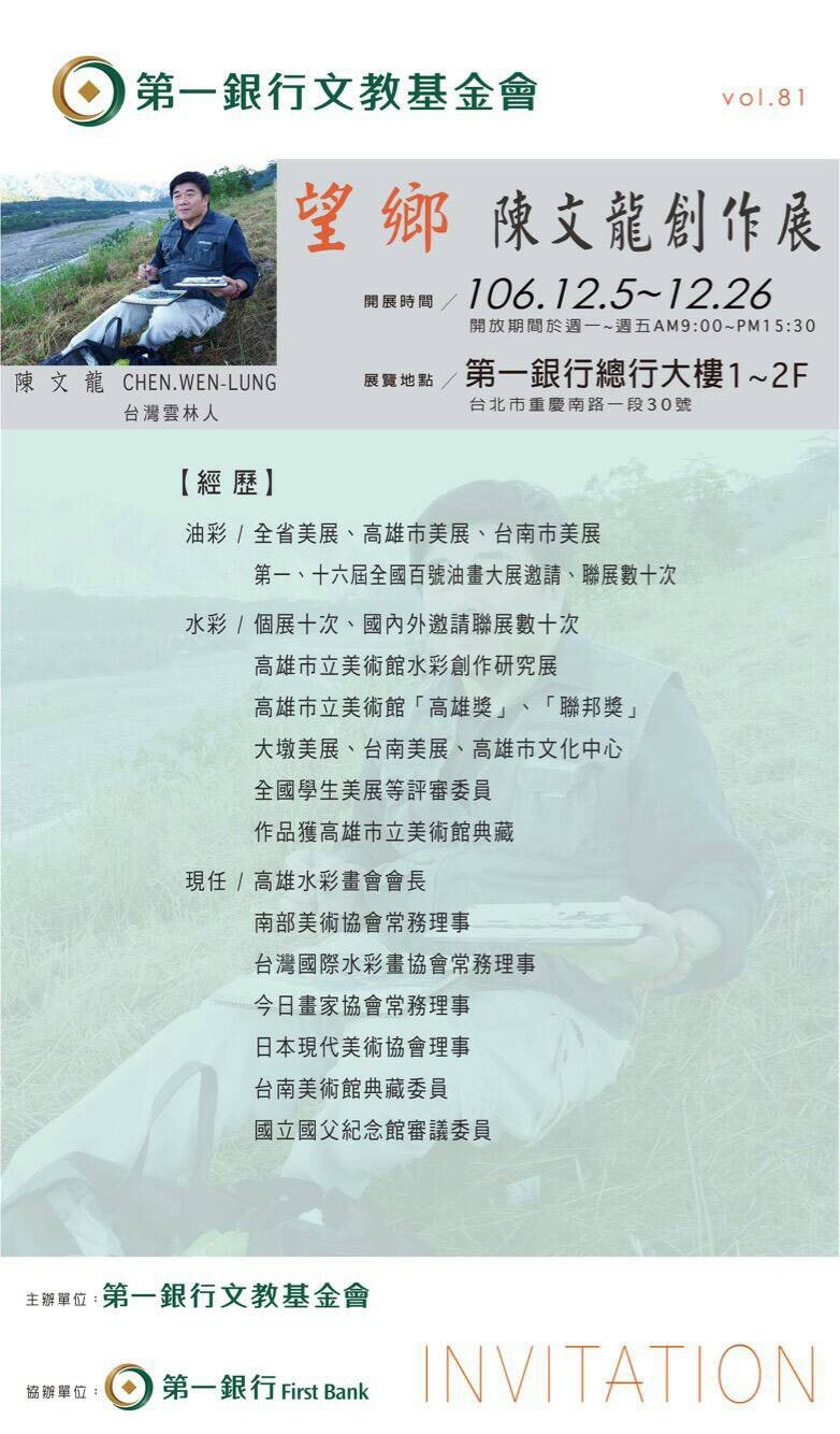 望鄉-陳文龍創作展 Super User 本站新聞 04 十二月 2017 點擊數: 1629 Email 展覽時間:2017.12.5~12.26 地點:第一銀行總行大樓1~2F (台北市重慶南路一段30號) 上一篇 下一篇 tweet