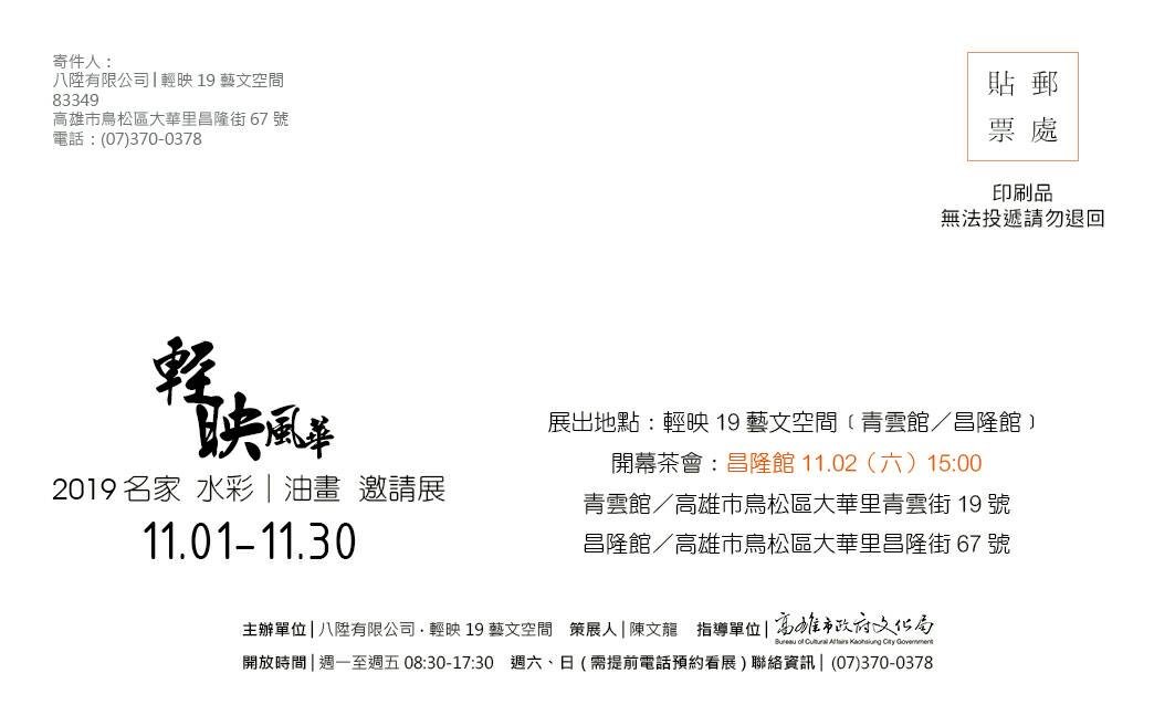 輕映風華- 2019名家水彩、油畫邀請展 Super User 本站新聞 18 十月 2019 點擊數: 1738 Email 請點圖放大瀏覽! 展覽日期:2019.11.1~11.30地點:輕映19藝文空間開幕:昌隆館 11.2(六)15:00青雲館(高雄市鳥松區大華里青雲街19號)昌隆館(高雄市鳥松區大華里昌隆街67號) 上一篇 下一篇 tweet