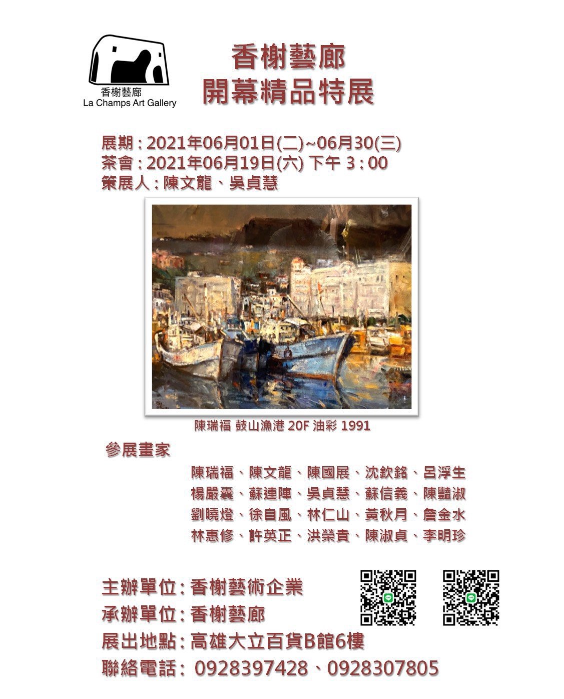 香榭藝廊開幕精品特展 Super User 本站新聞 08 六月 2021 點擊數: 1620 Email 展期:6.1~6.30地點:高雄市大立百貨 B館6樓開幕茶會:6.19 PM15:00 上一篇 下一篇 tweet